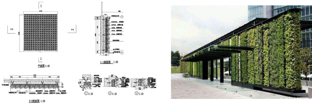 图3 垂直绿化设计图纸(左)和实景参考(右)