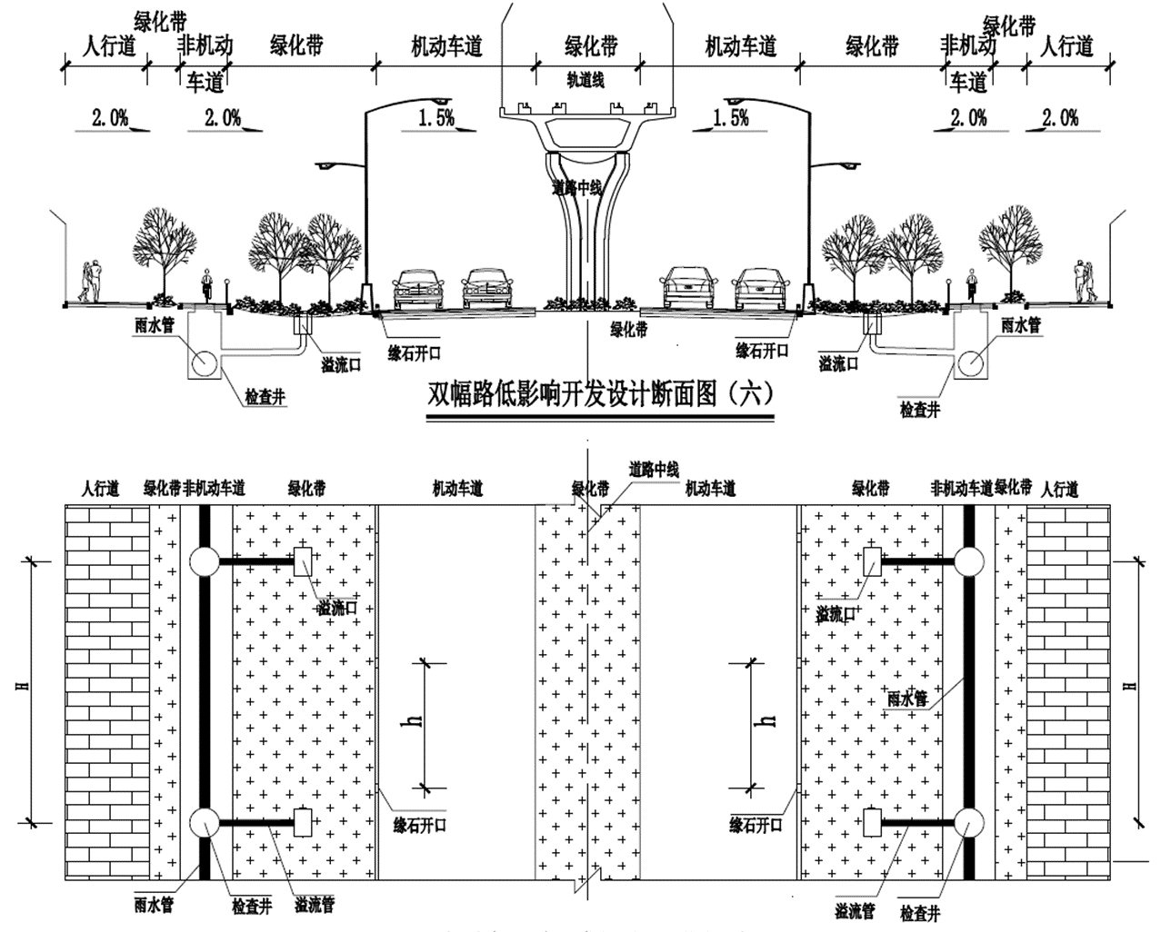 (3)针对用地紧张且分布占比较多的高架道路、轨道线路高架路面雨水径流控制、桥下空间利用,新增了海绵城市建设解决方案,即高架路面雨水汇流至绿化带,当水位高于溢流口顶面标高时溢流进入下游管道系统排走。