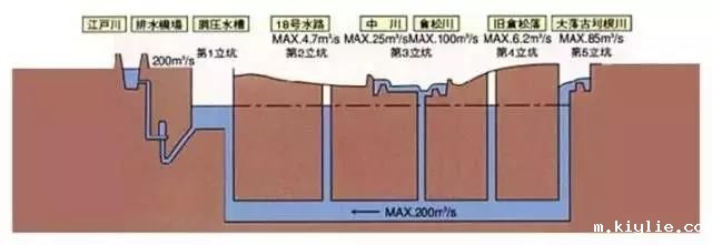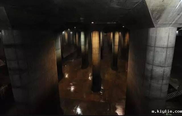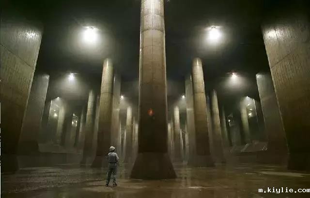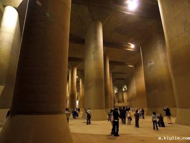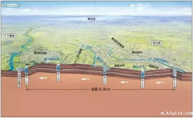 东京地区地下排水系统于1992年开工,2006年竣工,共耗资30亿美元,是世界上最大、也是最先进的下水道排水系统。排水系统全长6.4公里,包括5个深65米、宽32米的巨型竖井,竖井之间由内径约10米的管道连接起来,前4个竖井里导入的洪水通过下水道流入最后一个竖井,集中到由59根高18米、重500吨的大柱子撑起的巨大蓄水池中。