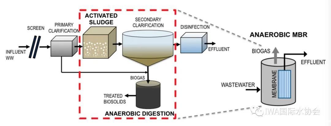 图. AnMBR的工艺流程示意图,它旨在取代红色虚线框内的工序设备和占地面积