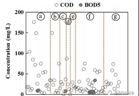 图. 混合AnMBR处理合成或实际污水的出水质量 (COD和BOD5): (a) AnMBRs + 搅拌颗粒; (b) AnMBRs + 吸附剂; (c) AnMBRs + 正渗透; (d) AnMBRs + 化学品; (e) AnMBRs + 电化学; (f) 前处理 + AnMBRs; (g) AnMBRs + 后处理。