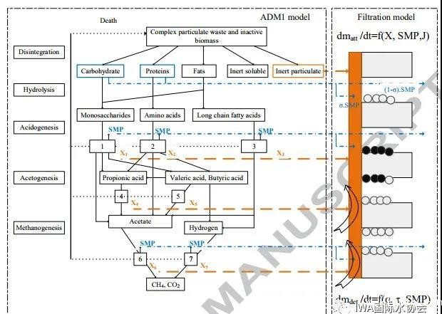 图. AnMBR模型结合了生物模型ADM1, SMP(溶解性微生物产物)动力学 和过滤模型