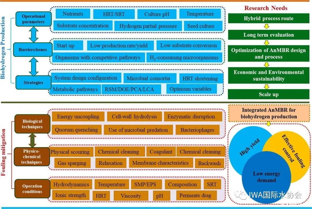 这篇文章也刊登在2018年的《Bioresource Technology》里,作者来自巴基斯坦、韩国、马来西亚和挪威的大学。本文主要评估了AnMBR工艺用于生物产氢的实用性,对目前的研究进展和遇到新问题进行批判性的探讨。针对这些问题,作者介绍了一些可能可以克服这些障碍的技术。最后他们还就该理念的经济可行性进行了展望。