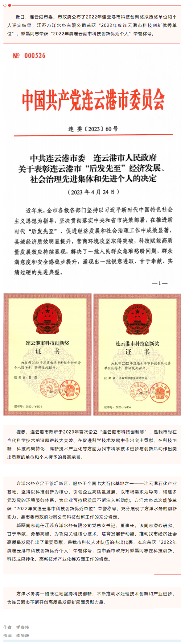 科技创新结硕果丨方洋水务荣获两项连云港市科技创新奖