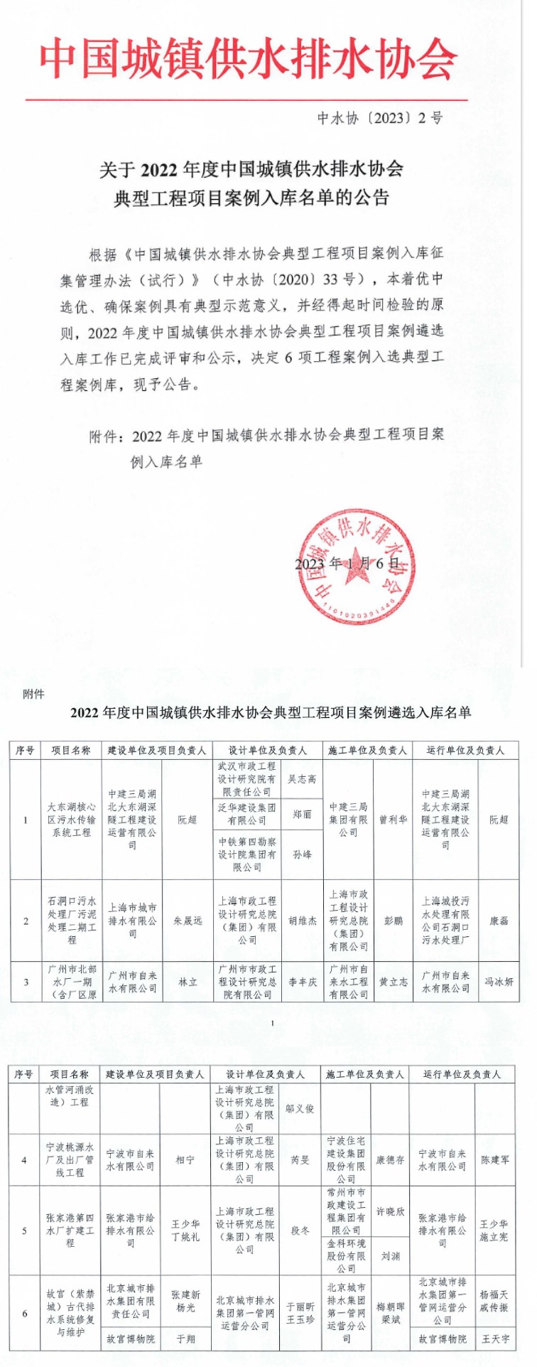 关于2022年度中国城镇供水排水协会典型工程项目案例入库名单的公告